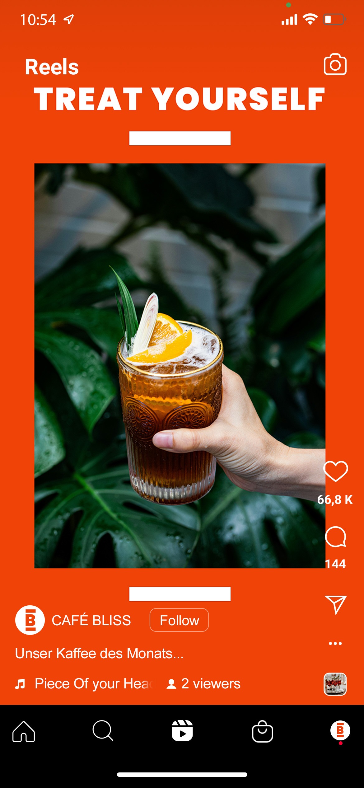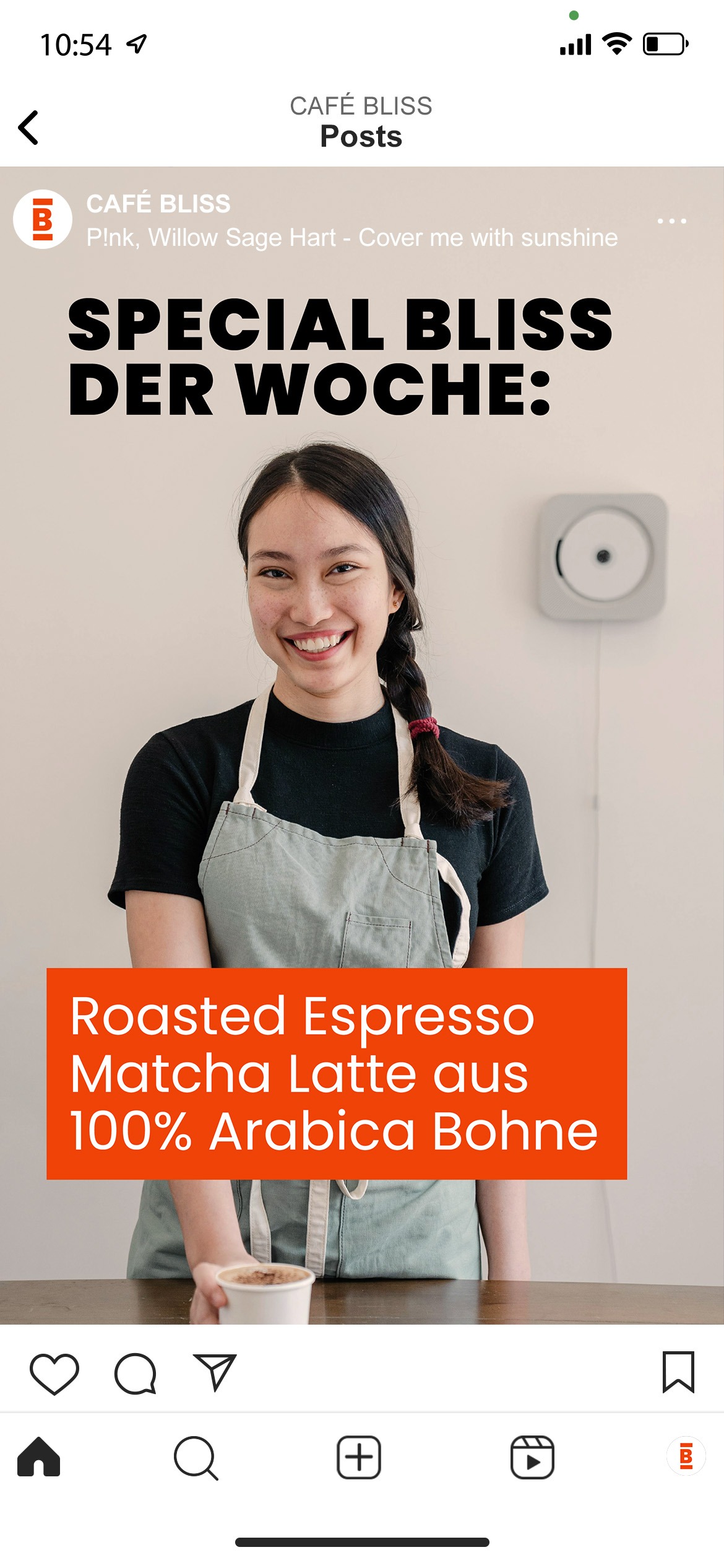 Für das Café Bliss wurde eine komplette Markenidentität entwickelt. Ziel war es, ein entspanntes Kaffeeerlebnis zu vermitteln, das moderne, urbane Kaffeeliebhaber anspricht. Die Arbeit umfasste die komplette CI-Entwicklung, Logo, Farb- und Bildsprache sowie die Konzeption von Social-Media-Inhalten und Auftritt.